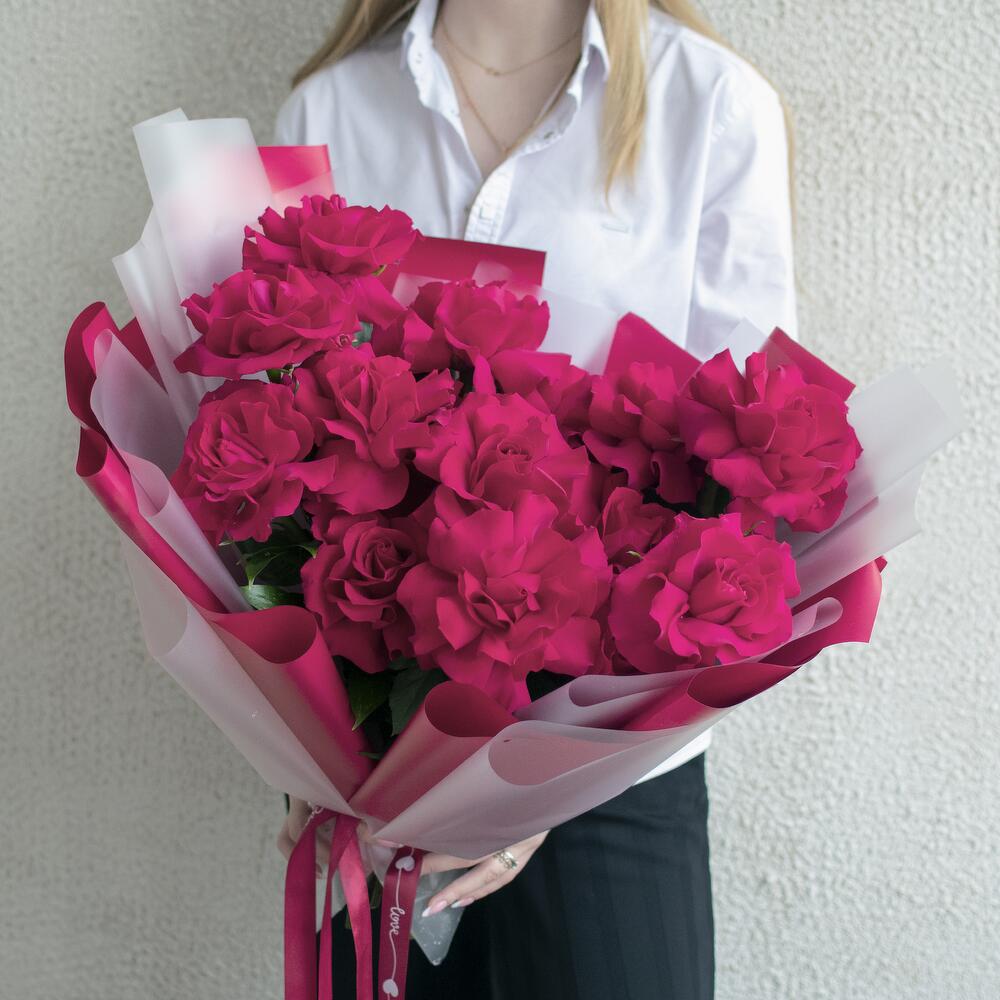 Роскошный монобукет из французских роз в стильной упаковке