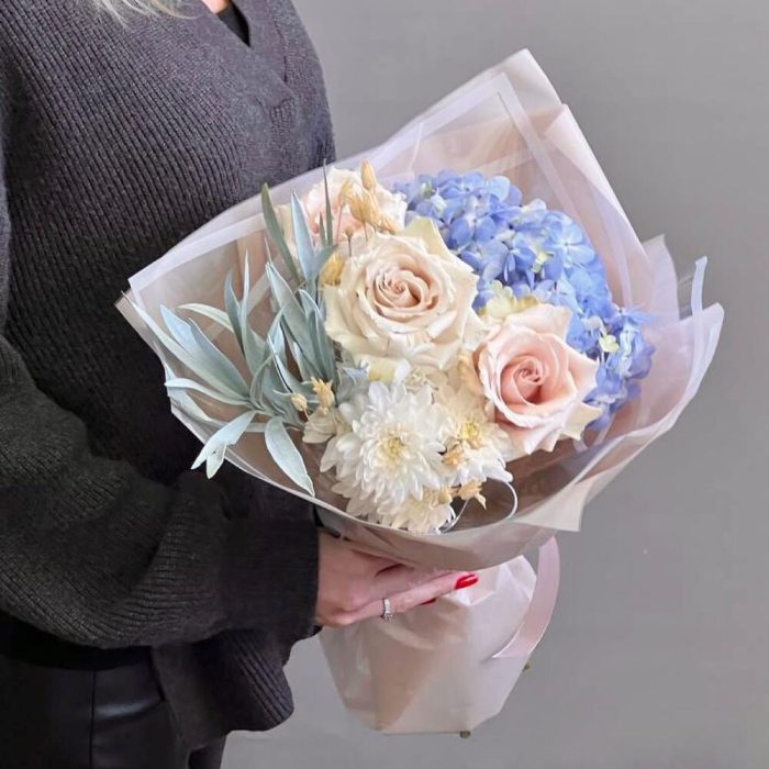 Голубая гортензия и пудровые розы
