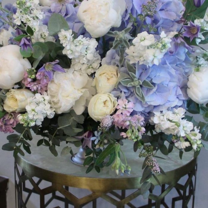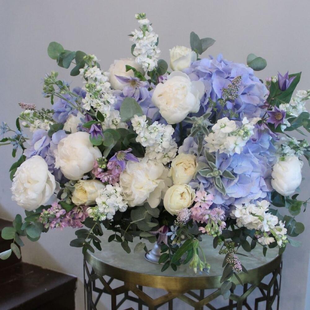 Гортензия – 4 шт.Пион – 7 шт.Роза пионовидная – 9 шт.Маттиола – 15 шт.Клематис – 5 шт.Твидия – 5 шт.Стахис – 5 шт.Травы – 5 шт.Эвкалипт – 15 шт.Кашпо – 1 шт.