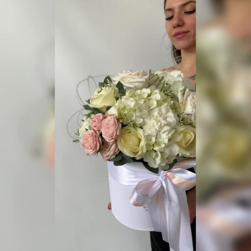 Гортензия и пионовидные розы Охара в большой коробке “Белоснежка”