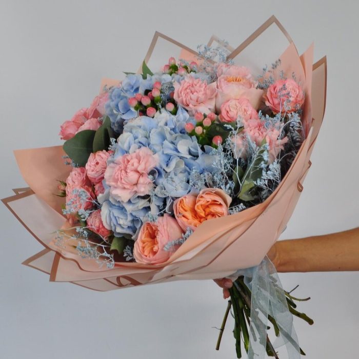 Гиперикум – 3 шт.Гортензия – 2 шт.Роза кустовая – 5 шт.Эвкалипт – 5 шт.Лента атласная – 1 шт.Диантус – 4 шт.Упаковка дизайнерская – 2 шт.Роза пионовидная Джульетта – 5 шт.кермек голубой – 6 шт.хорошее настроение (в подарок) – 1 шт.
