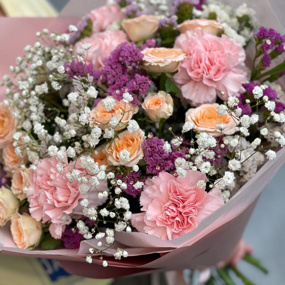 Гвоздики, Кустовые розы, Лизиантусы, Пионовидные розы, Розы