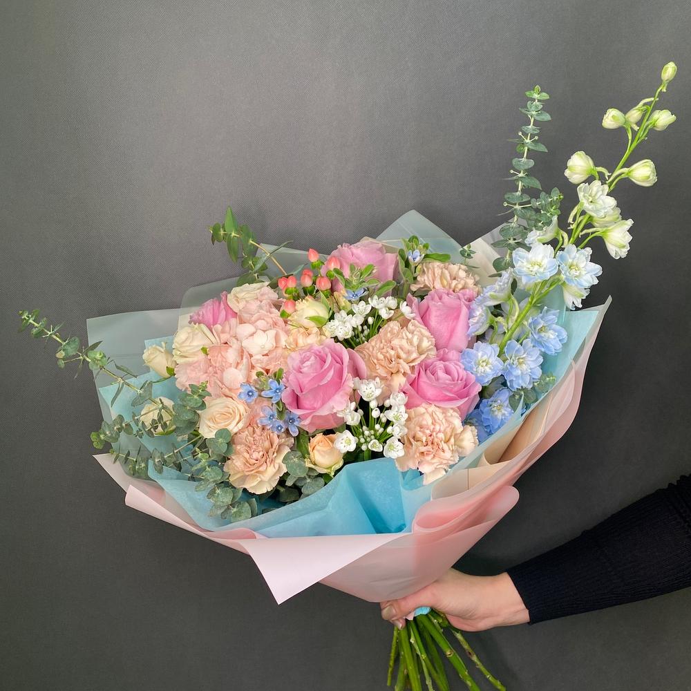 Гиперикум – 1 шт.Роза кустовая – 2 шт.Роза Эквадор – 5 шт.Диантус – 4 шт.Упаковка дизайнерская – 1 шт.Гортензия розовая – 1 шт.Эвкалипт Baby Blue – 3 шт.Дельфиниум голубой – 1 шт.аллиум кустовой – 3 шт.твидия гол – 3 шт.