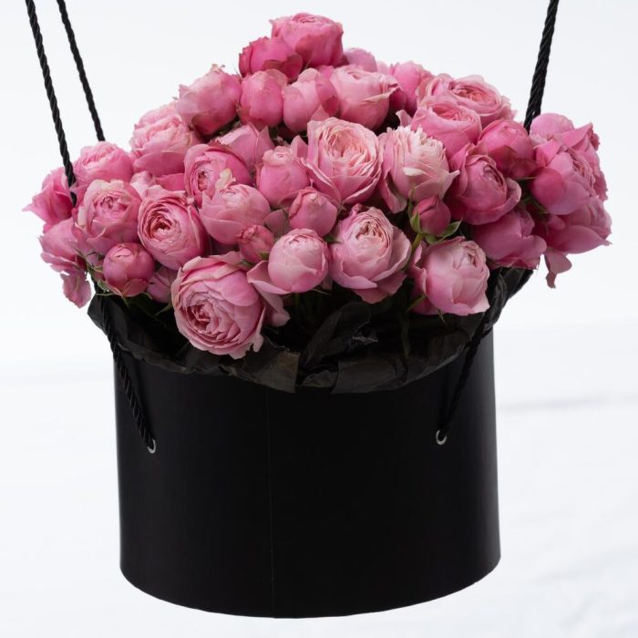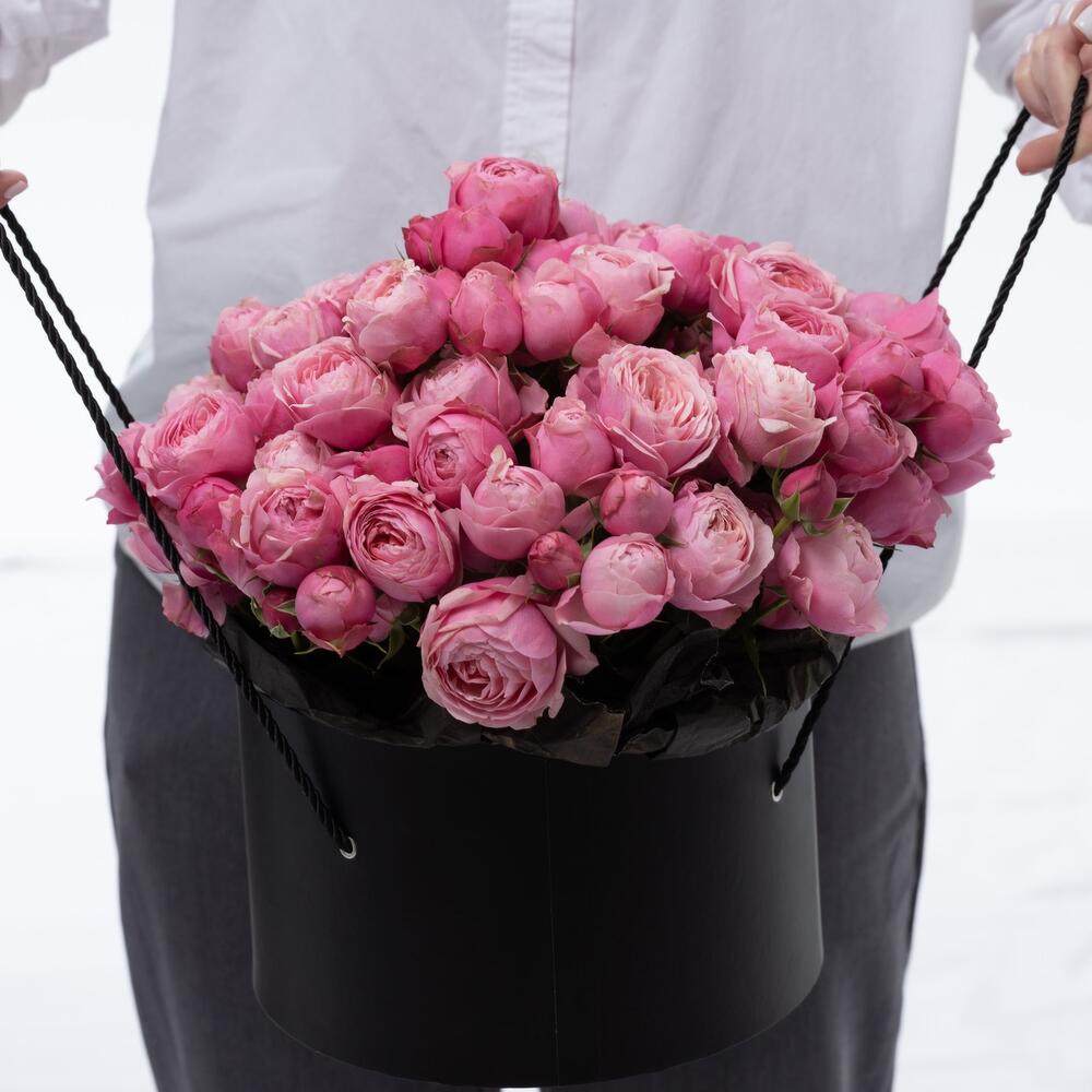 Роза пионовидная – 51 шт.Коробка шляпная – 1 шт.Лента атласная – 1 шт.Открыточка с вашими пожеланиями – 1 шт.хорошее настроение – 100 шт.инструкция по уходу за цветами – 1 шт.Кризал – 1 шт.