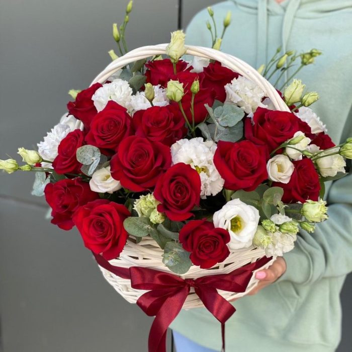 Корзина из красных роз, эустомы и эвкалипта !