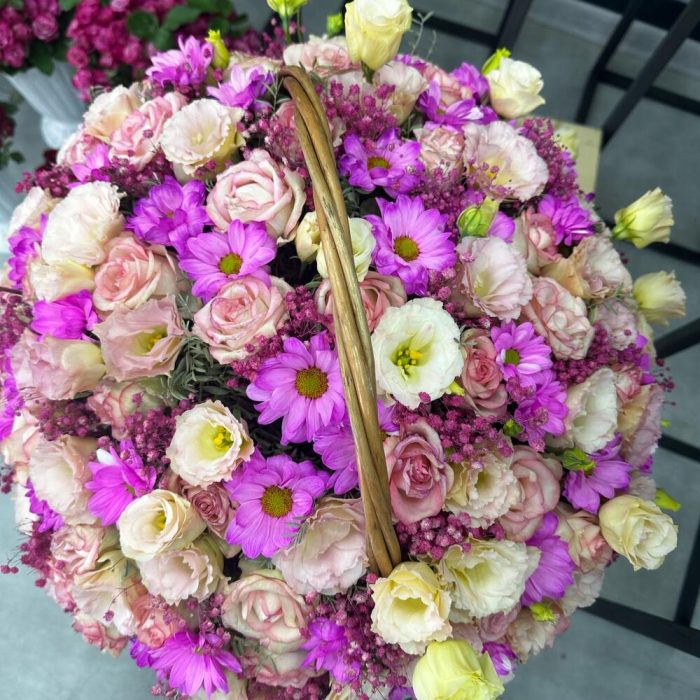 Роза – 29 шт. Хризантема – 33 шт. Эустома – 11 шт. Корзина плетеная – 1 шт. декоративная зелень – 5 шт.