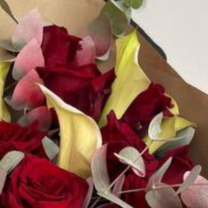 Роза красная – 9 шт.Лента атласная – 1 шт.Калла белая – 4 шт.Крафт упаковка – 3 шт.