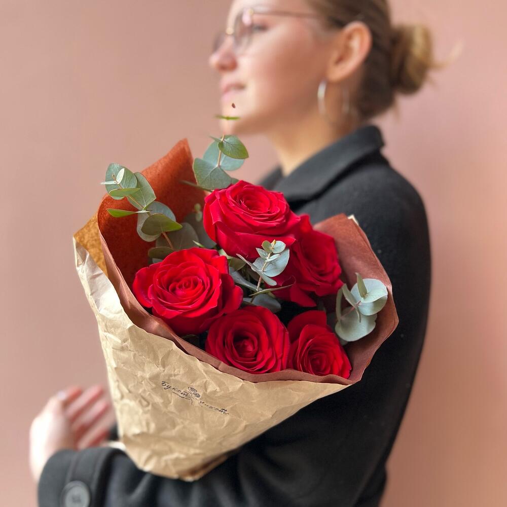 Лента – 1 шт.Эвкалипт – 1 шт.Тишью – 1 шт.Крафт – 1 шт.Красная роза – 5 шт.
