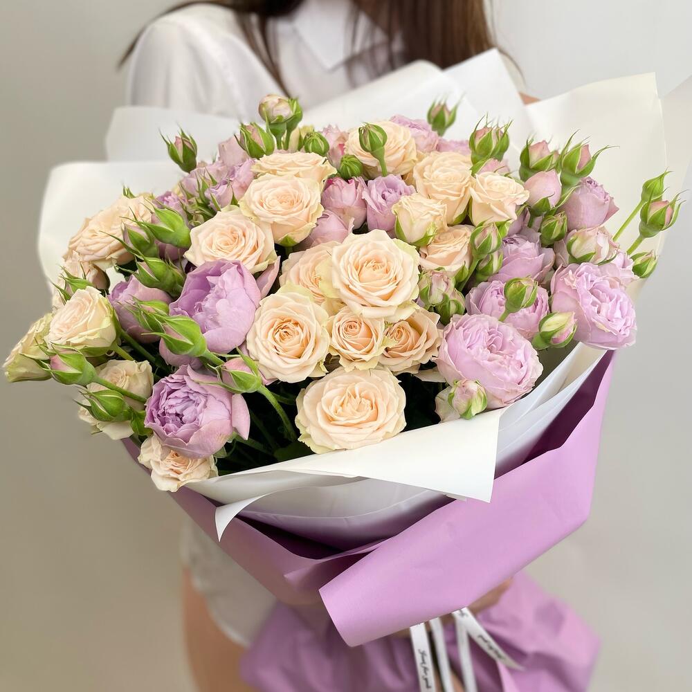Букет из моно пионовидной кустовой розы Джульетта и эвкалипт