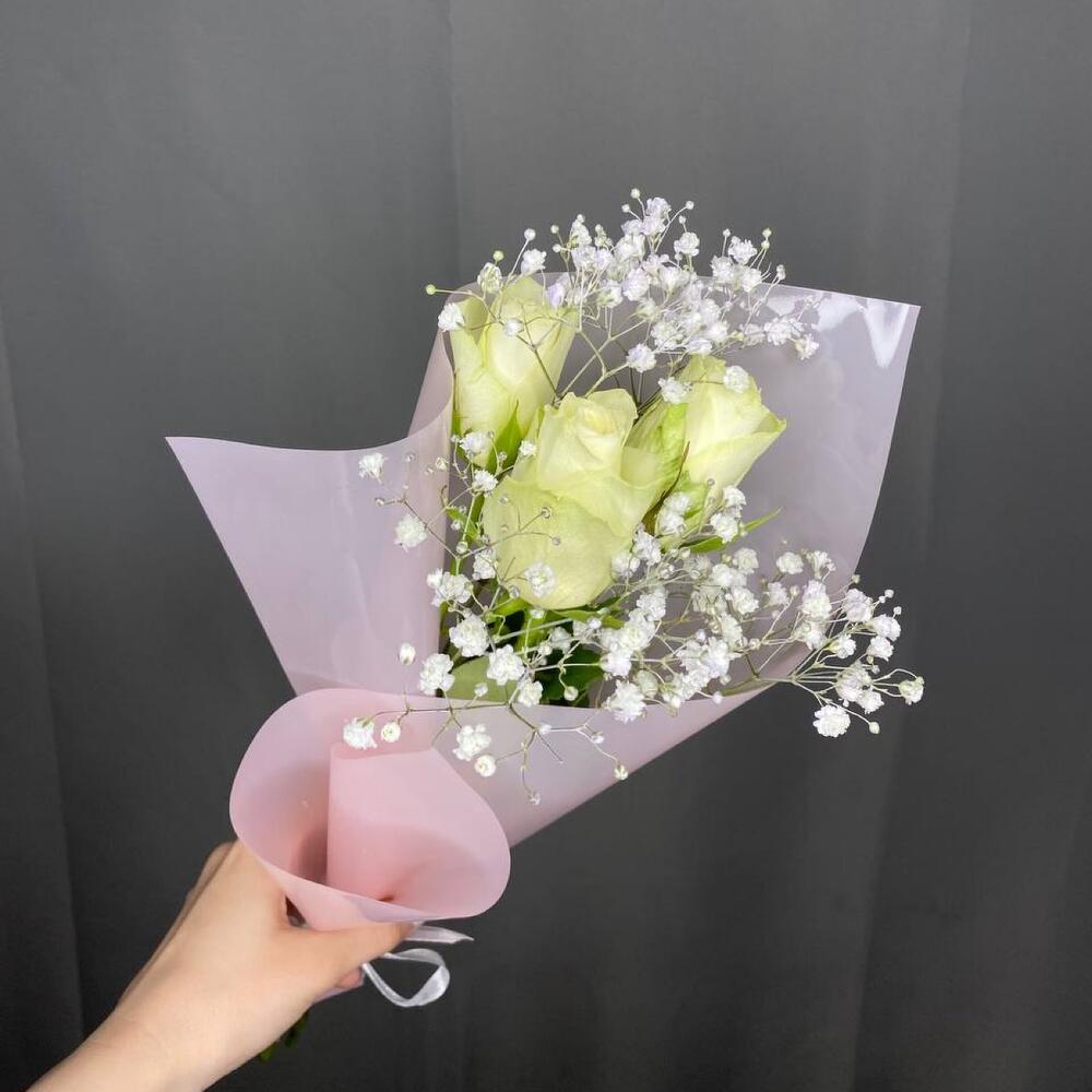 роза кения – 3 шт.Гипсофила – 1 шт.Упаковка дизайнерская – 1 шт.Лента атласная – 1 шт.