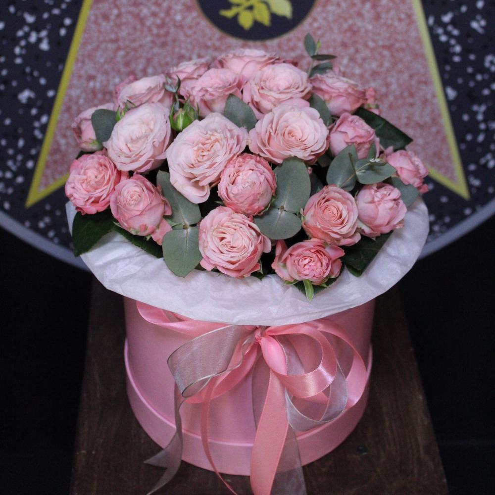 Роза кустовая пионовидная – 9 шт.Эвкалипт – 3 шт.Тишью – 2 шт.Оазис флористический – 1 шт.Шляпная коробка – 1 шт.Лента атласная – 2 шт.