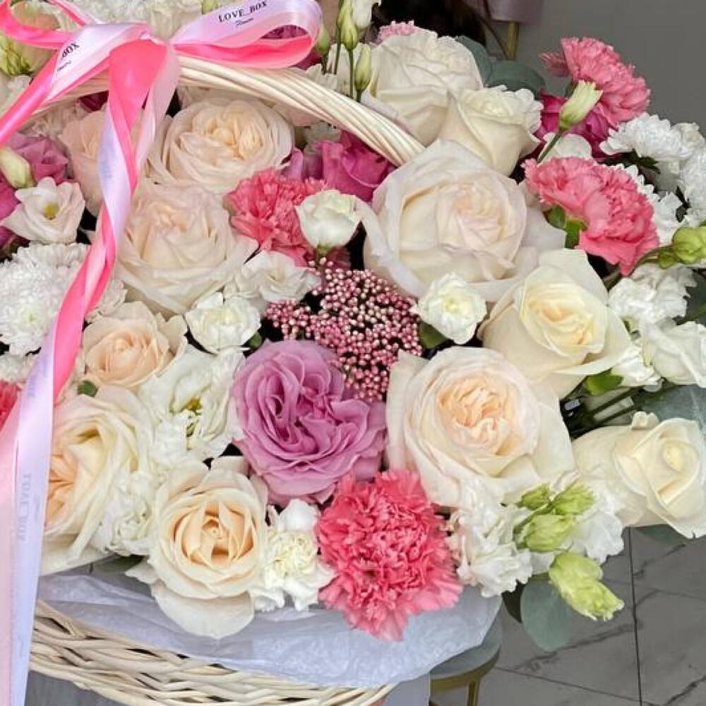 Пионовидная роза – 7 шт.Роза Эквадор – 12 шт.Лизиантус – 5 шт.Хризантема кустовая – 5 шт.Озотамнус – 1 шт.Диантус – 11 шт.Эвкалипт – 6 шт.Корзина плетеная – 1 шт.