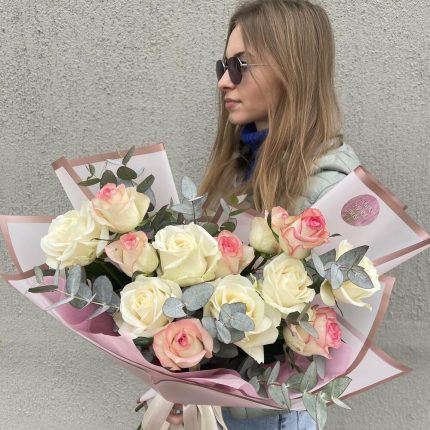 кустовые пионовидные розы – 11 шт. Упаковка дизайнерская – 1 шт. Открыточка с вашими пожеланиями – 1 шт. инструкция по уходу за цветами – 1 шт.