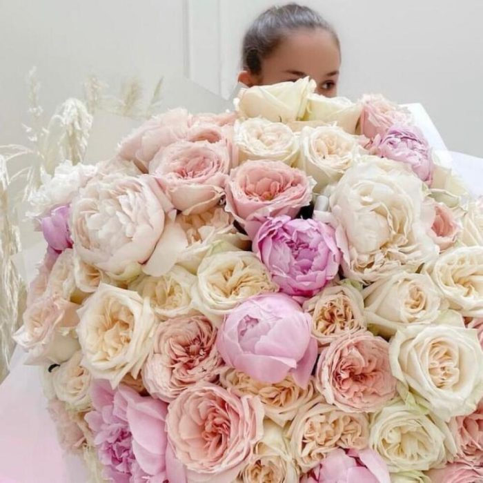 Пион розовый – 9 шт.розы пионовидные – 42 шт.Упаковка дизайнерская – 2 шт.Лента атласная – 2 шт.Открыточка с вашими пожеланиями – 1 шт.хорошее настроение – 100 шт.инструкция по уходу за цветами – 1 шт.коробка переноска – 1 шт.Кризал – 1 шт.