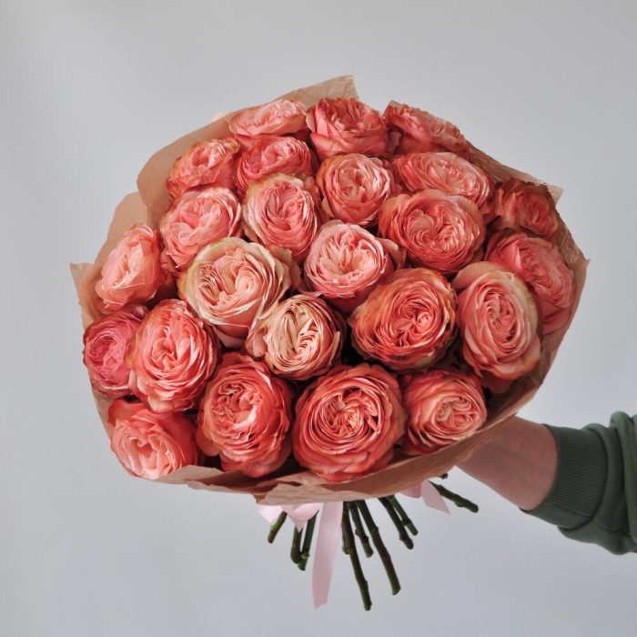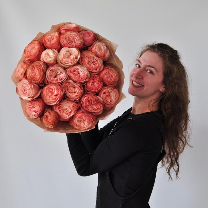 Лента атласная – 1 шт.Упаковка дизайнерская – 2 шт.роза кахала пионовидная 50 см – 25 шт.