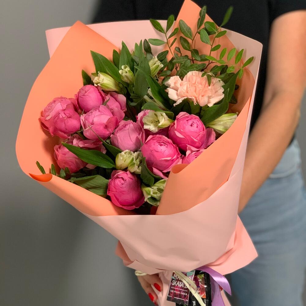 Милый приятный букет с пионовидной кустовой розой, Котора напоминает лето и Тепло, альстромерия и гвоздичка, которая стоит до 2-3 недель и писташ, освежающая букет подарят радость родному человеку для продления жизни цветочков мы добавляем кризал к букету