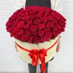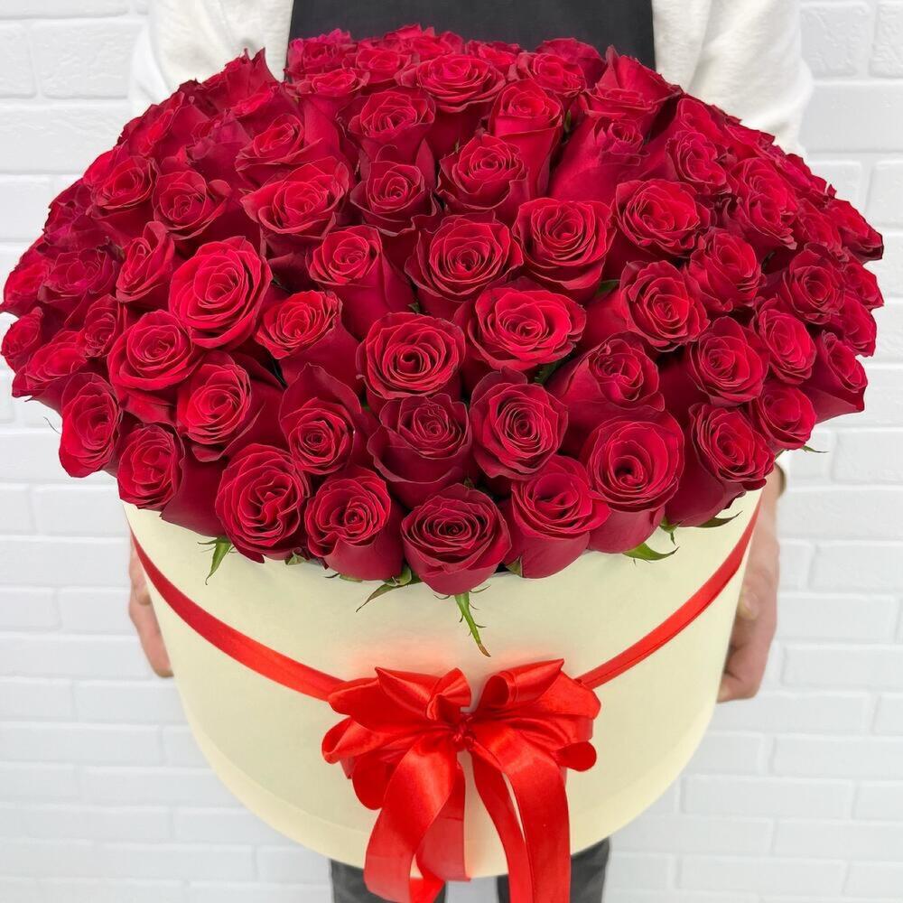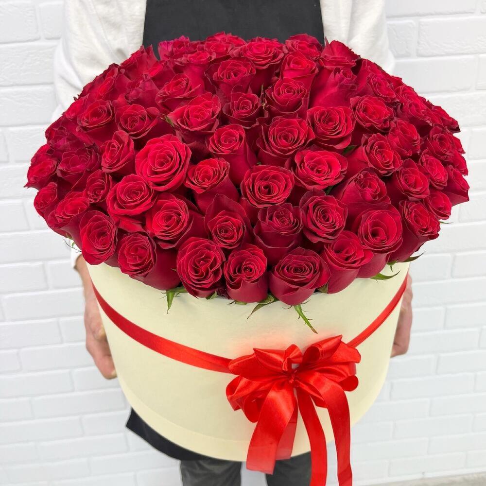 розы эквадор – 101 шт.Шляпная коробка – 1 шт.Лента атласная – 1 шт.