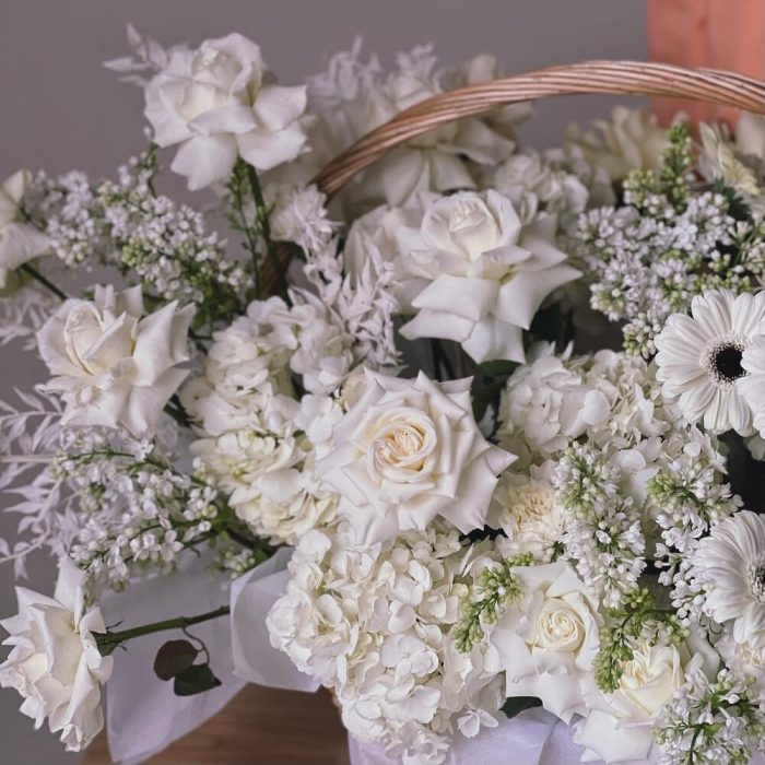 Шикарная пышная белоснежная корзина с гортензиями и герберой