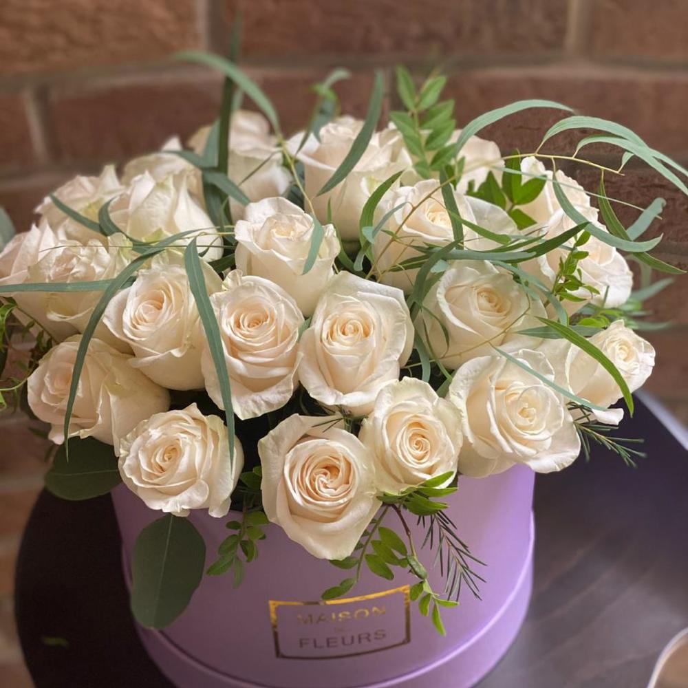 25 белых эквадорских роз с эвкалиптом в шляпной коробке. Не нужно искать вазу, легко транспортировать