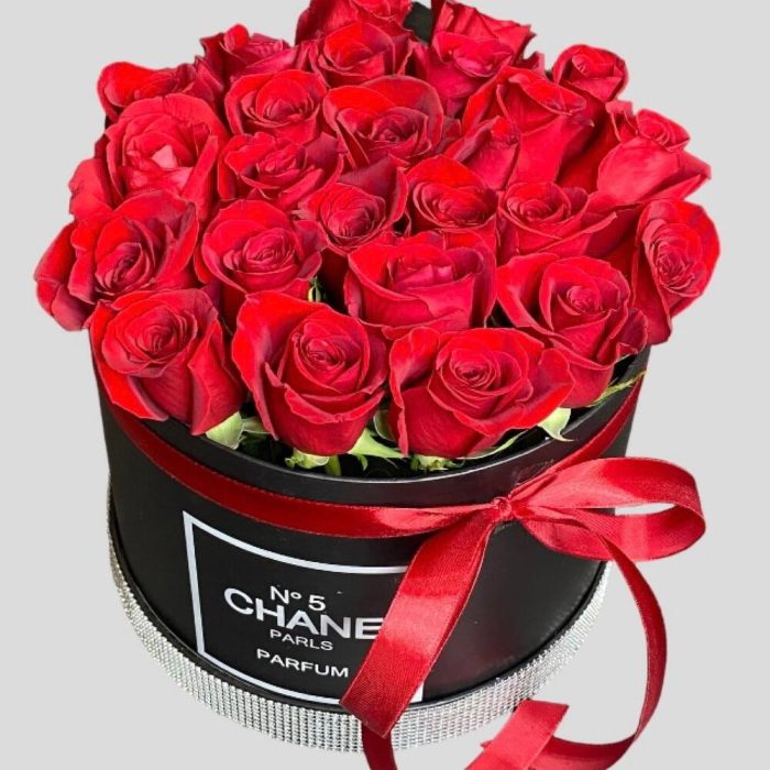 Красные розы в черной коробке и с атласной лентой