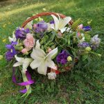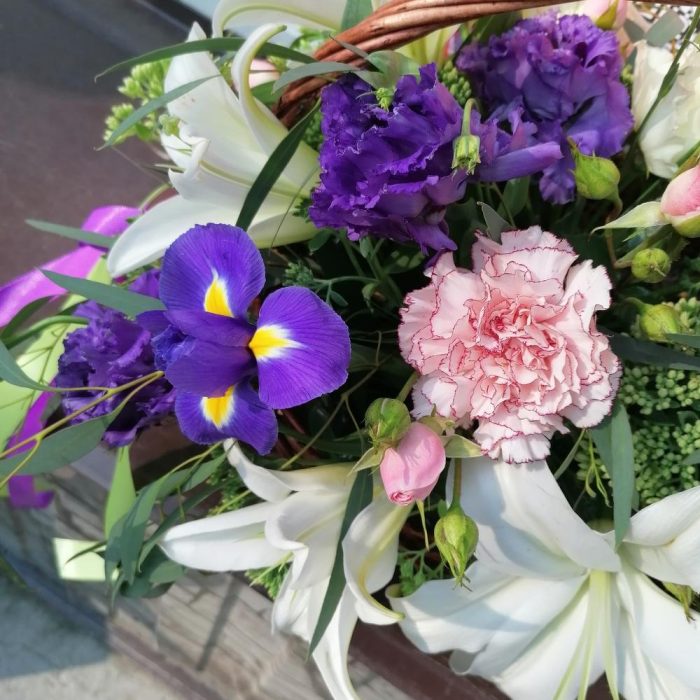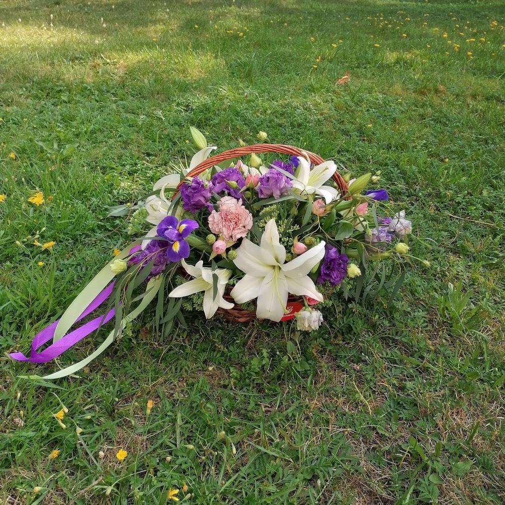 Корзина – 1 шт.Оазис флористический – 1 шт.Эустома – 3 шт.Гвоздика – 2 шт.Лилия – 2 шт.Очиток – 5 шт.Эвкалипт – 5 шт.Ирис – 3 шт.Роза кустовая – 2 шт.Лента атласная – 2 шт.