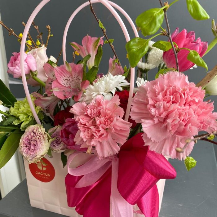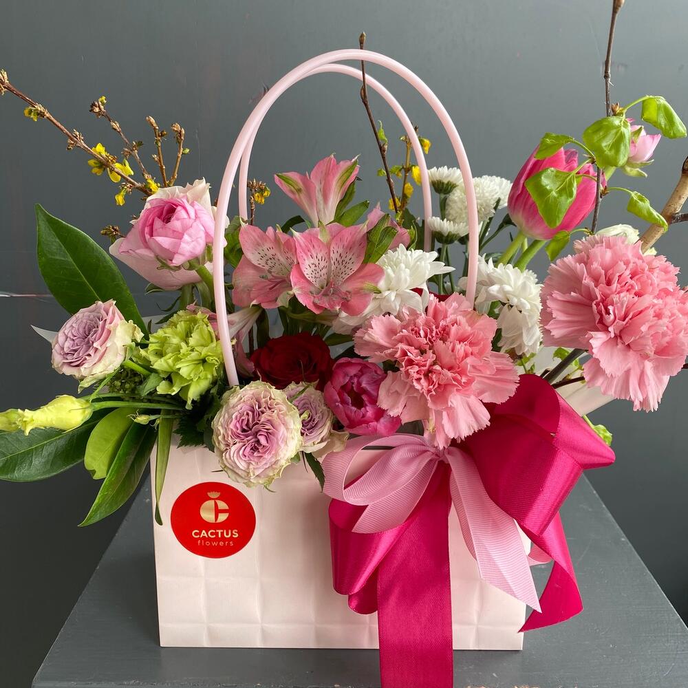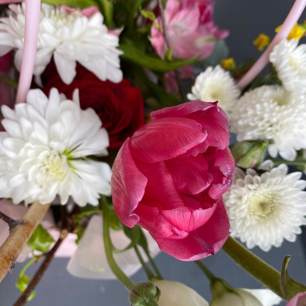 Гвоздики, Лизиантусы, Розы, Тюльпаны