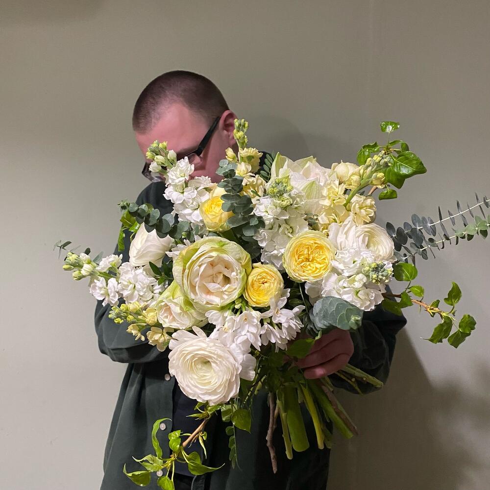 Амариллис – 2 шт.Нарцисс кустовой – 3 шт.Ранункулюс – 4 шт.Маттиола – 7 шт.Роза пионовидная кустовая – 3 шт.Эвкалипт – 9 шт.Ветки – 2 шт.Сирень белая – 2 шт.