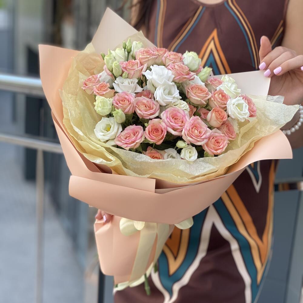 кустовая роза азора – 5 шт. эустома белая – 4 шт. Оформление – 1 шт. Писташ – 2 шт.