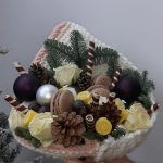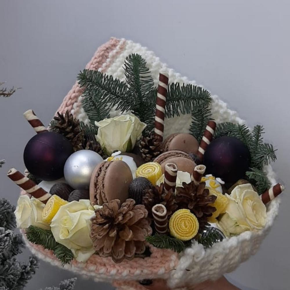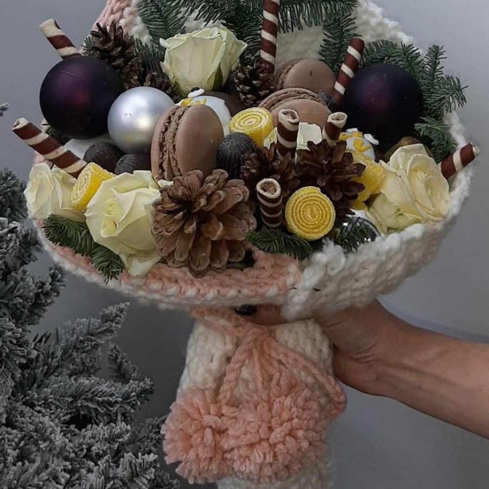 Роза белая – 5 шт.Макарон – 5 шт.Шишки – 6 шт.Мармелад – 6 шт.пингвины шокаладка – 2 шт.Шарики новогоднии – 4 шт.Нобилис – 2 шт.