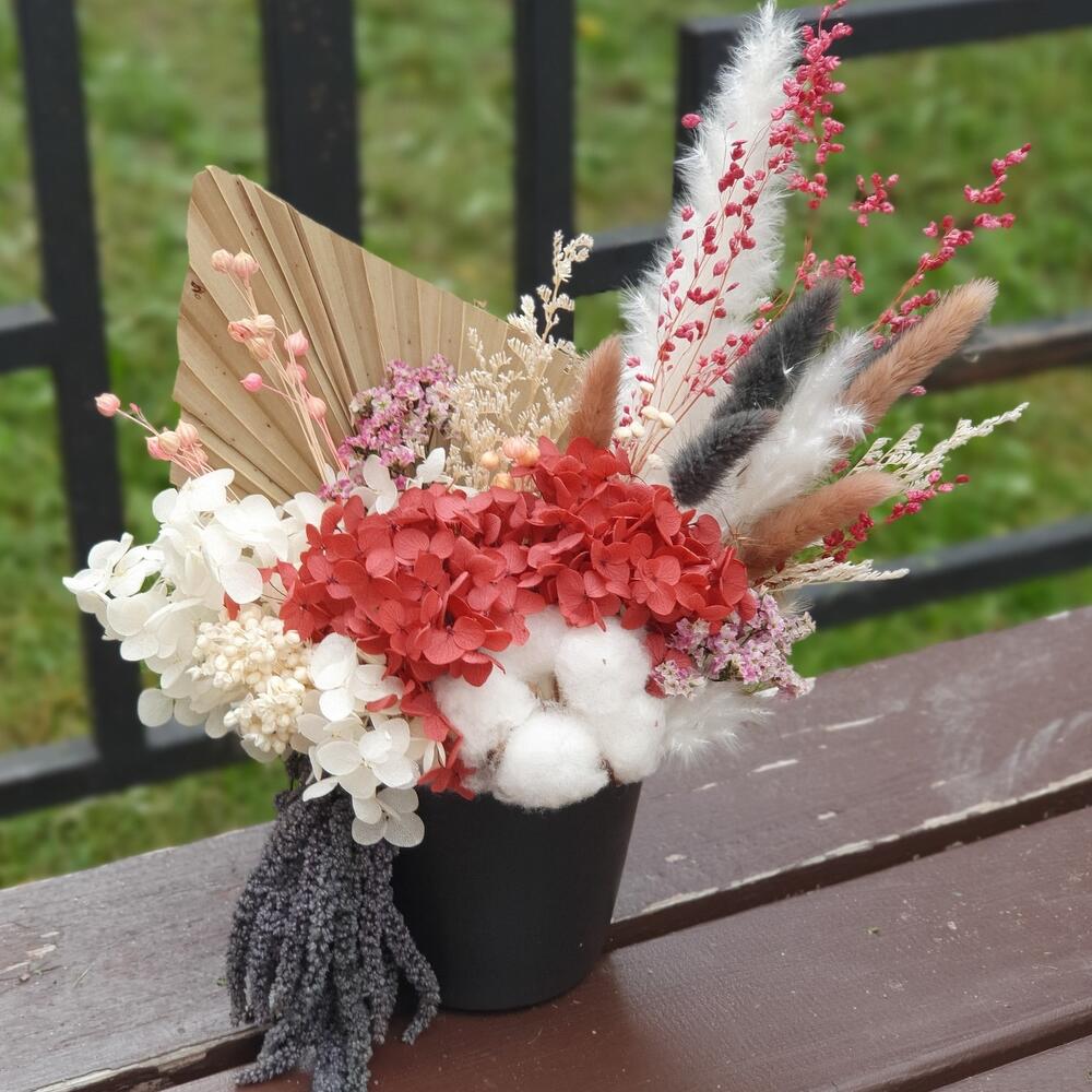 гортензия стабилизированная пучок – 2 шт.мини пампас – 2 шт.Лагурус (сухоцвет) – 5 шт.бриза пучок – 1 шт.Лен – 3 шт.амарант стабилизированный – 1 шт.копье пальмы – 1 шт.сорго – 1 шт.статица стабилизированная – 2 шт.Кермек – 2 шт.Хлопок натуральный – 1 шт.ботао – 6 шт.Кашпо керамическое – 1 шт.