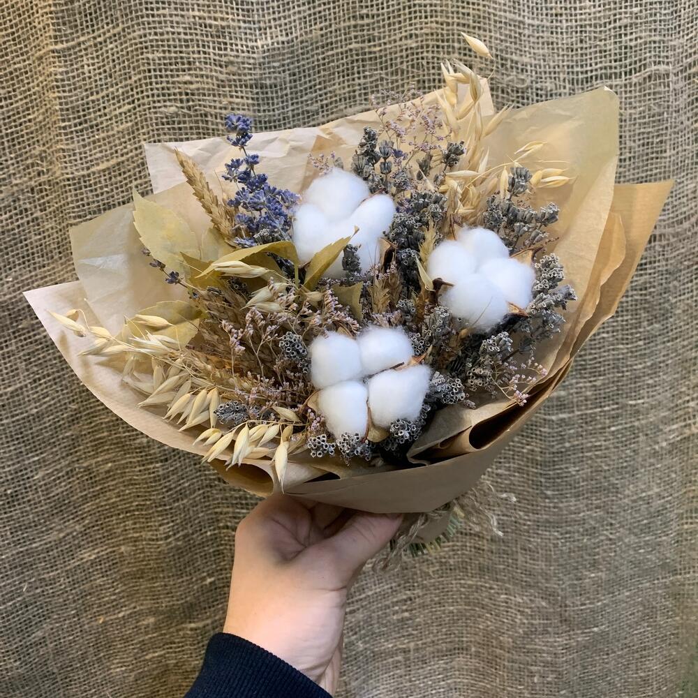 Лимониум – 1 шт.Тишью – 1 шт.Пшеница (сухоцвет) – 17 шт.бечевка натуральная – 1 шт.овес сухоцвет – 7 шт.хлопок белый – 3 шт.лаванда крымская – 1 шт.крафт натуральный – 1 шт.листья искуственные – 2 шт.лаванда садовая – 1 шт.
