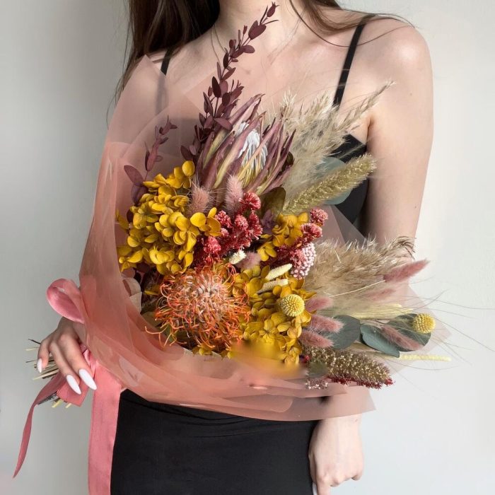 Букет “Савана” – это воплощение дикой и красивой природы Африки. В нем собраны самые яркие и необычные цветы, которые можно найти на этом континенте. Африканская протея, с ее необычной формой станет главным украшением букета. Нутан добавит красок и подчеркнет … Показать ещёэкзотический характер композиции. Гортензия, с ее нежными лепестками, придаст букету изящества и романтичности. А эвкалипт, своим ароматом и текстурой, дополнит букет неповторимым шармом и создаст атмосферу диккой природы. Букет “Савана” – это отличный выбор для тех, кто любит необычные и яркие решения во всем.